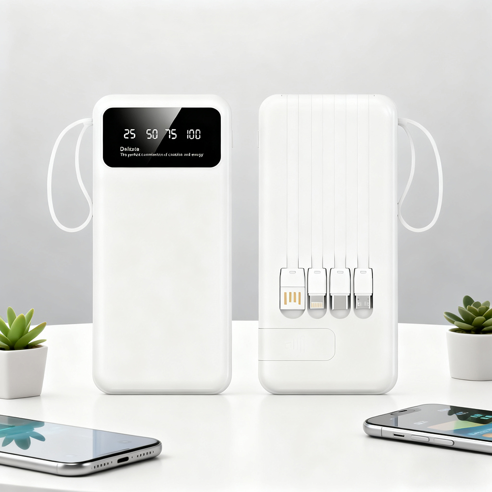 10000mAh Portable Power Bank - All-in-One Charging Solution,Designed for on-the-go convenience, this 10000mAh power bank combines reliable power storage with user-friendly features to keep your devices charged anywhere, anytime. Crafted with a durable plastic housing in a sleek white finish, it boasts a minimalist yet practical design that fits seamlessly into bags, purses, or pockets.
