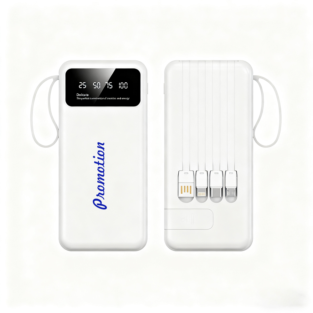 10000mAh Portable Power Bank - All-in-One Charging Solution,Designed for on-the-go convenience, this 10000mAh power bank combines reliable power storage with user-friendly features to keep your devices charged anywhere, anytime. Crafted with a durable plastic housing in a sleek white finish, it boasts a minimalist yet practical design that fits seamlessly into bags, purses, or pockets.